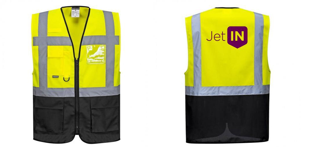 Customize your safety vest with the Custom Warsaw Yellow and Black Professional Style Safety Vest. This ANSI/ISEA 107-compliant vest features reflective tape for increased visibility, a front zip opening for easy access, multiple pockets for convenient storage, and a range of corporate colors to choose from. Add your company logos or personalize it with custom text. Stocked and shipped from the USA.