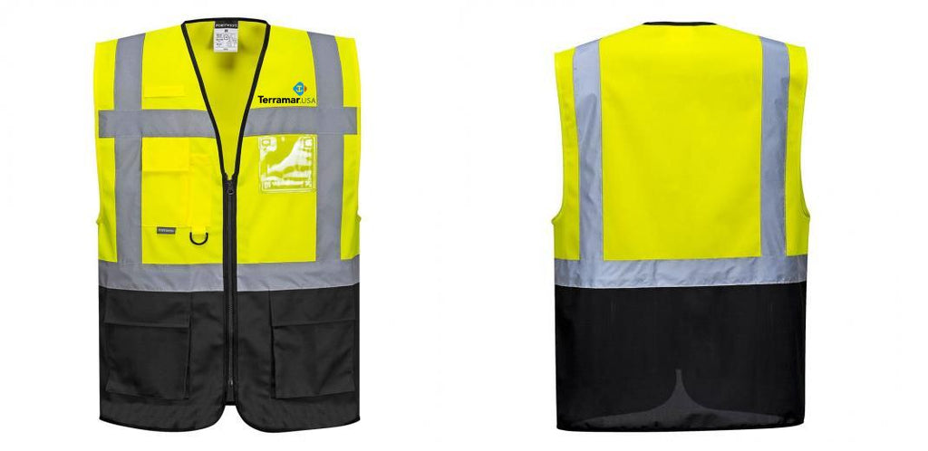 Customize your safety vest with the Custom Warsaw Yellow and Black Professional Style Safety Vest. This ANSI/ISEA 107-compliant vest features reflective tape for increased visibility, a front zip opening for easy access, multiple pockets for convenient storage, and a range of corporate colors to choose from. Add your company logos or personalize it with custom text. Stocked and shipped from the USA.